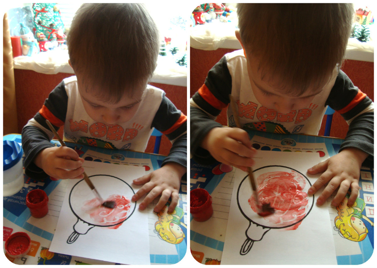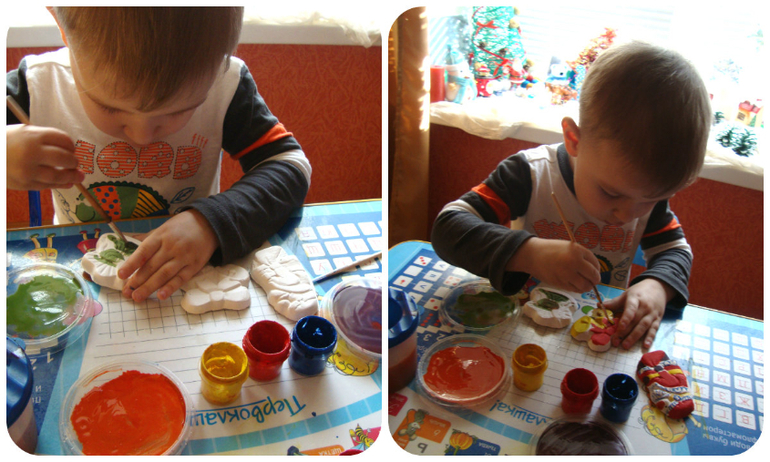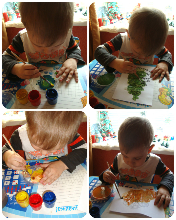 Затем мы отправились в "покрасочный цех" - познакомились там с волшебным кисточками, они научили нас смешивать краски и получать новые цвета. Кирюша был в таком восторге от этого - смешали все как надо - он сам выбирал нужные краски, ими мы раскрасили елочку и мандарин.