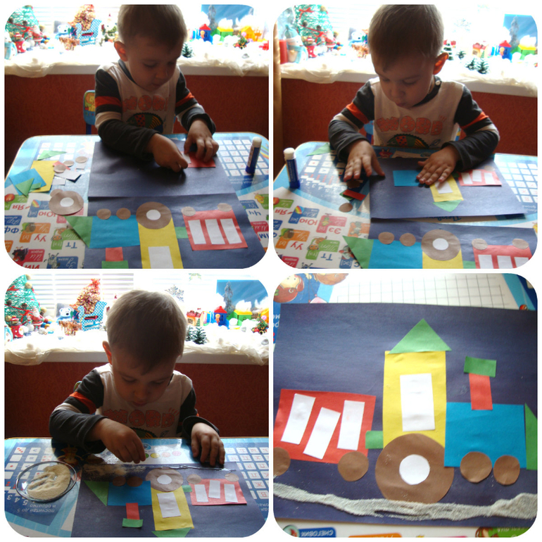 После этого мы сделали новогодний экспресс и снежную дорожку. Аппликация по образцу, дорожка из манки. Вот и у нас теперь есть транспорт на котором мы отправляемся в новогоднее путешествие по мастерской Деда Мороза.