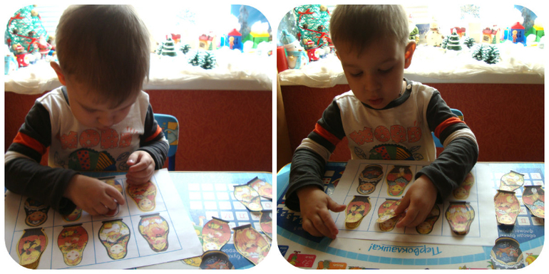 Первая наша остановка - это "цех" изготовления подарков - по видео помощники рассказывают о матрешки - мы ее тоже вспомнили - нашли по лото каждой из них сестренку.