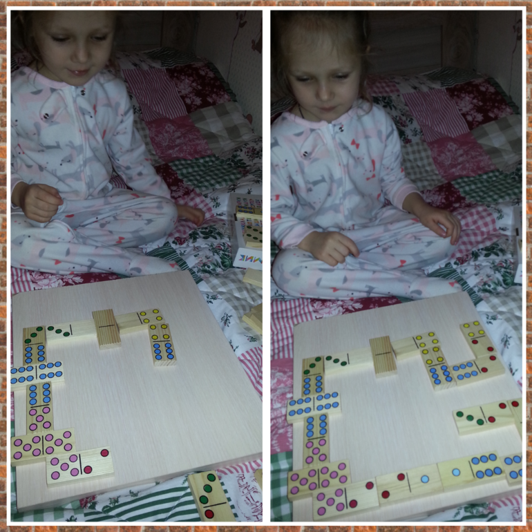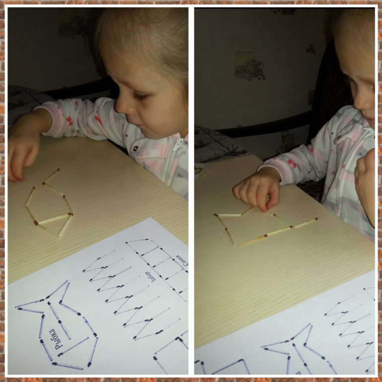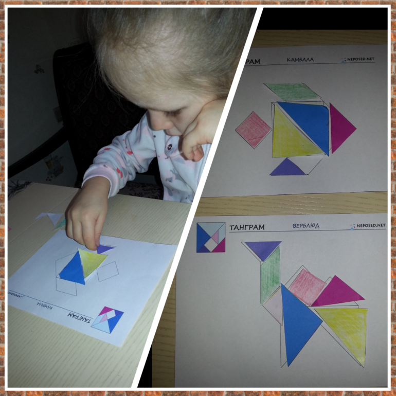 Собирали бумажный танграм. Анюта расстраивалась, что все разваливается, поэтому сделала только две фигуры: