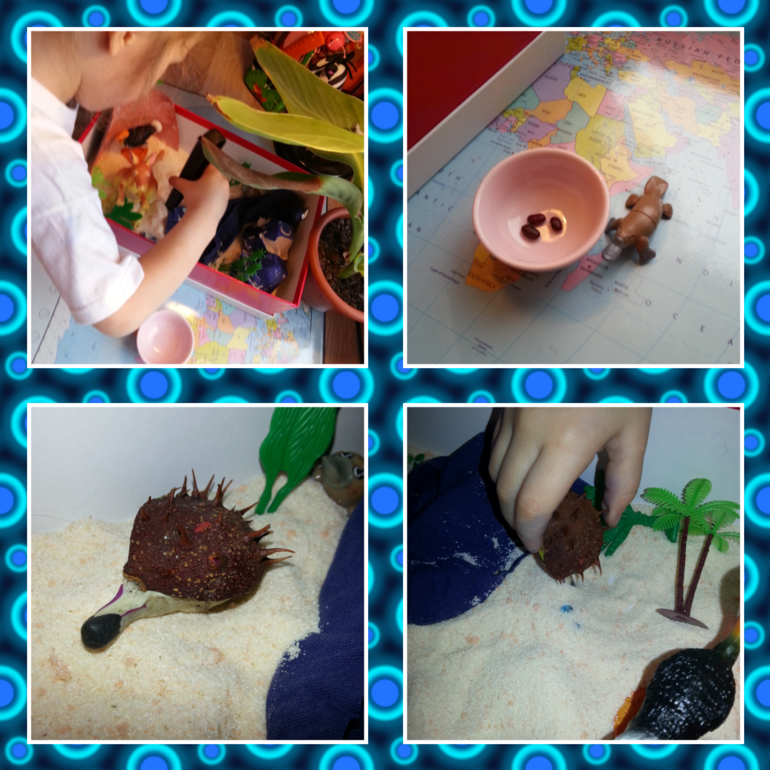 Фигурки ехидны у нас не было, но Аня (!) принесла нашего осеннего ежика из каштана и пластилина и предложила сделать из него ехидну. и почему я не догадалась? Помогали ей закапывать свои яйца в норку: