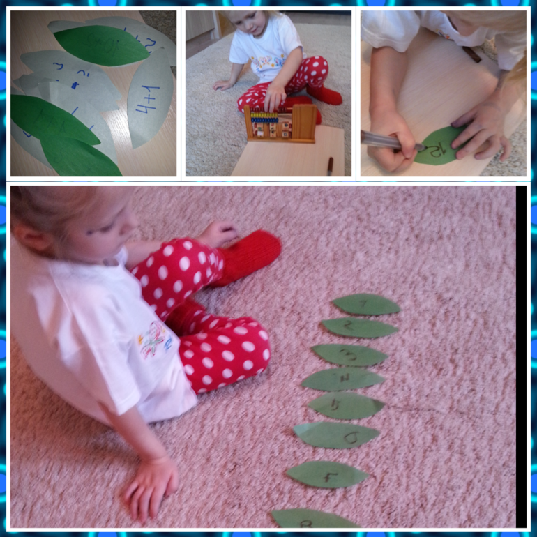 На листиках были написаны примеры на сложение и вычитание. Аня их решила и написала результат на обратной стороне листочка, а после выложила их по порядку: