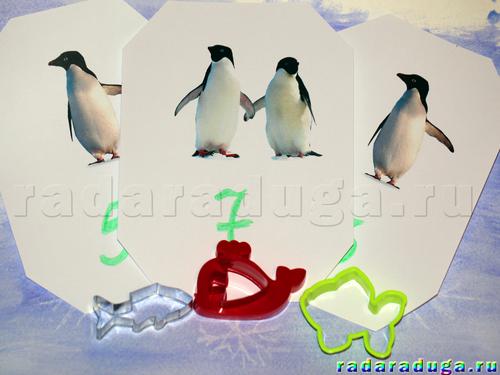 Кормим пингвинчиков рыбкой - у каждого ребенка по карточке с пингвином/пингвинами с цифрой. Из соленого теста голубого цвета вырезаем рыбок с помощью формочек. Выдаём первую букву.![]()