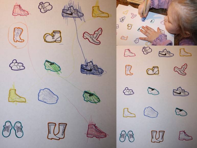 3. Нашли потерявшиеся пары обуви, раскрасили и соединили.