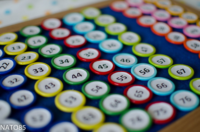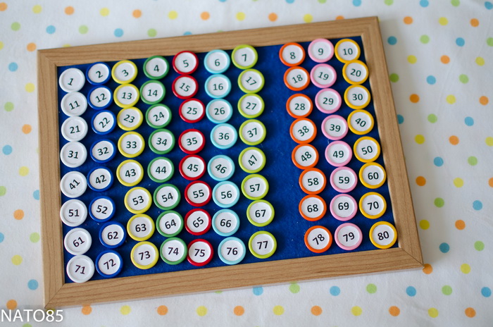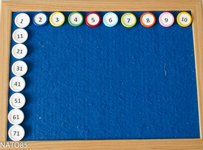 В моем варианте до 80, так как доска была определенного размера и 100 просто не поместилось, вернее я не стала мельчить... В оригинале все цифры на белом фоне + есть контрольная таблица. Зная своего ребенка я даже не стала пробовать сделать по методике, так как к однотонному Лиза просто не подойдет + у мне показалось так проще заниматься самостоятельно, когда мама не может сидеть все время рядом.