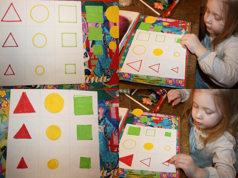 2. Распределяли фигуры в соответствии с названной: большая зеленая, средний квадрат, маленькая и т. д.