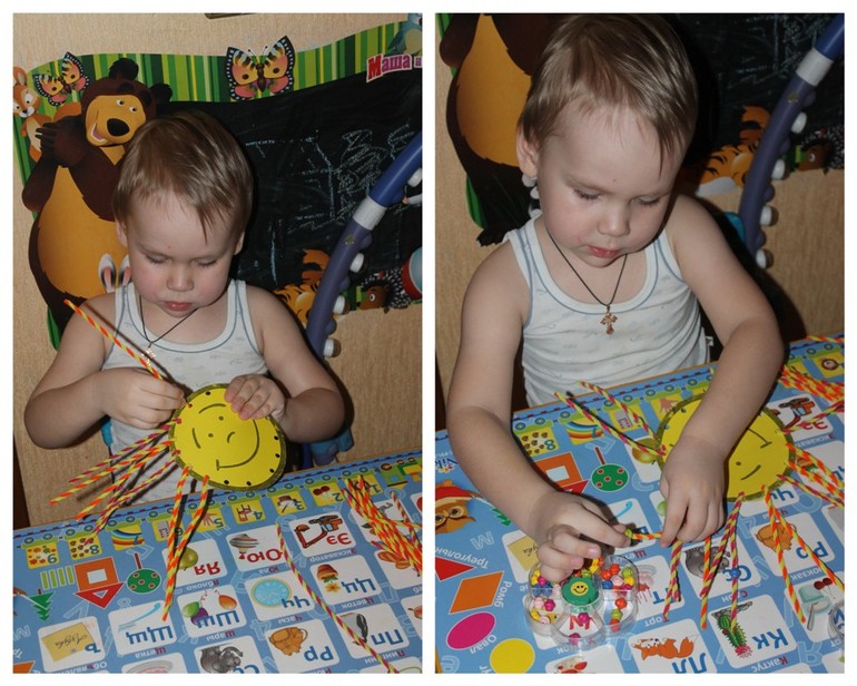 Начали мы с кликания весны. Для этого мы сделали солнышко из бумаги и синельной проволоки. Украсили лучики бусинками)