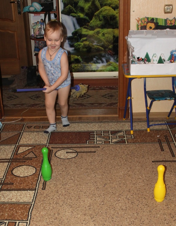 Но на этом наше веселье не закончилось. Поиграли в игру "Кто быстрее на метле". надо пробежать верхом на метле змейкой и при этом не сбить кегли. Игра пошла на ура. Играли долго и весело.