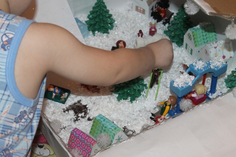 Сегодня у нас была сенсорная коробка. Хорошо было бы поиграть на улице, но когда я прихожу домой с работы, на улице уже темно, поэтому играем дома.