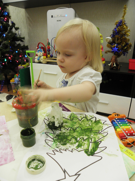 - Раскрашивает елочку штампами (губка, скомканная бумажка) и кисточкой, вот что получается.