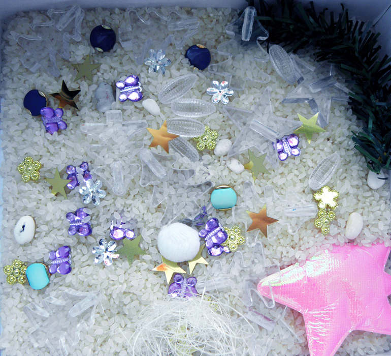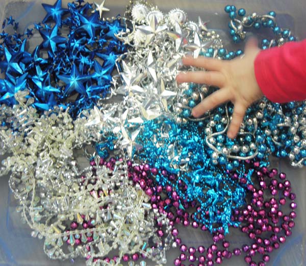 - Ну и самая любимая сенсорная коробка! Бусы для елочки, аж трясло в буквальном смысле, от счастья)))
