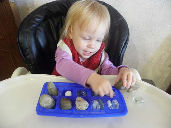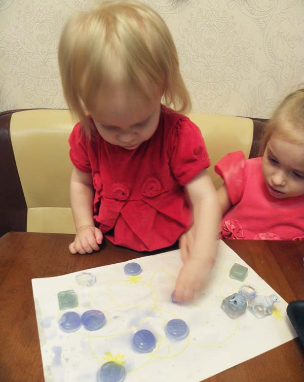 - еще одна игра с камушками-стекляшками, просто разложить по ячейкам, обращаю внимание на различия, где прозрачный как лед, а где обычный:
