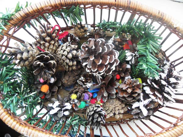 - что растет на елочке? Конечно шишки! Вот такая корзинка с шишками появилась, все трогает, изучает, помпоны пытается оторвать):