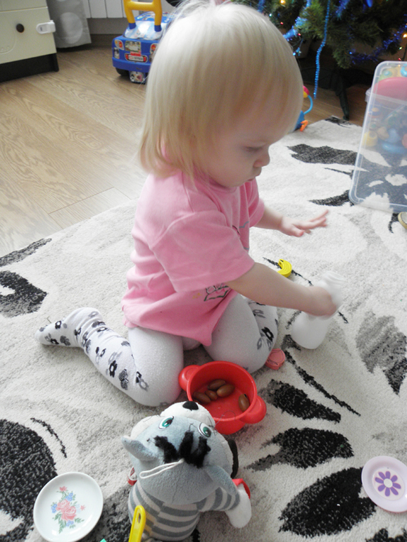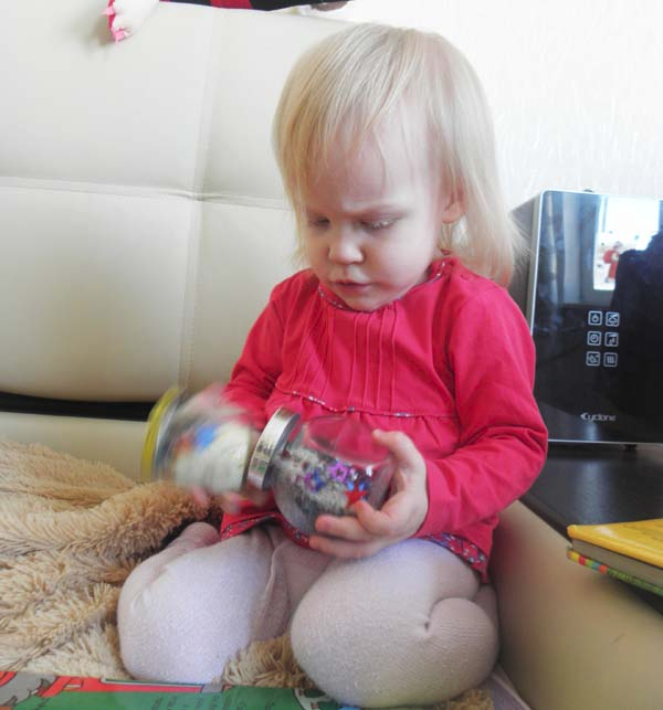 - баночки-шумелки с рисом, манкой и блестючками. Была в восторге, очень долго с ними играла):