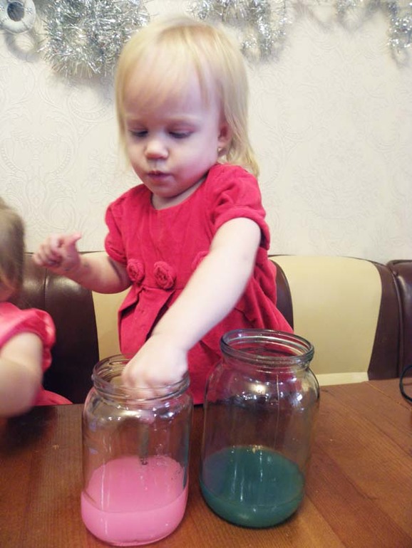 - оставляю лед в тарелке, смотрит как тает и превращается в воду. И потом наливаем воду в банки. Подкрашиваем ее краской. Вот тут понравился процесс: