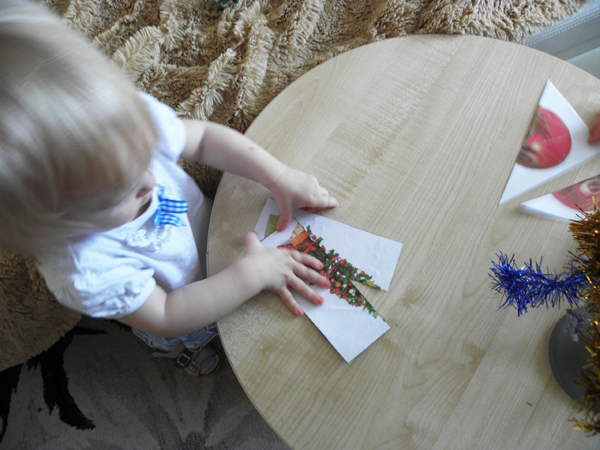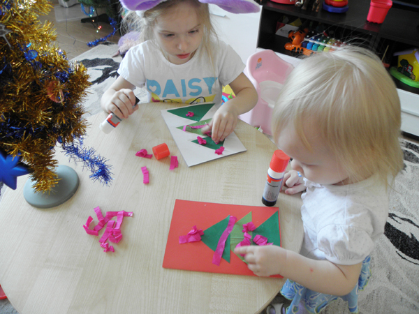 - Аппликация «Елочка», вымазывает клеем бумагу, я помогаю наклеить треугольники. Заодно учим фигуру - треугольник и что можно из нее соорудить. Сверху снова вымазывает клеем и прикладывает украшения - полоски гофрированной бумаги: