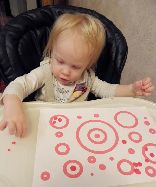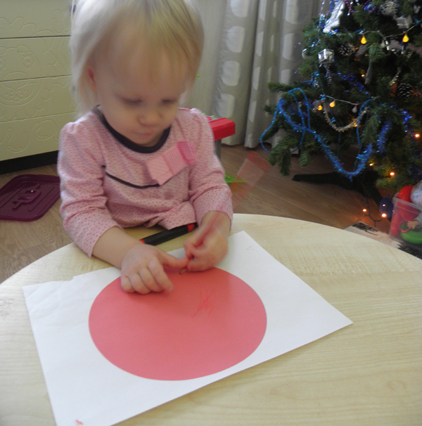 - в основном игрушки - шарики. А они какие? Круглые! Раскрашиваем красный круг красными карандашами. Заодно учим цвета и фигуры/формы!