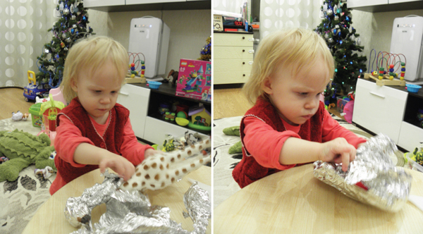 - а вот что сделал мороз и снег с нашими игрушками! Надо их освободить! Сосредоточенно освобождала, обнаружила под фольгой жирафа и машинку, радовалась безмерно)))