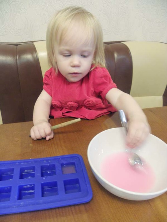 - и снова делаем лед! Попросила перелить подкрашенную воду в формочки для льда с помощью ложки. Пыталась и ложкой и кисточкой, и конечно руками))))