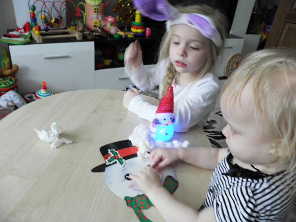 - делают снеговичка из ватных дисков, рисуют глазки, ротик, пуговички. У Лизиного Снеговичка диски клеила я, так как она попыталась их приклеить в разных углах бумаги)))