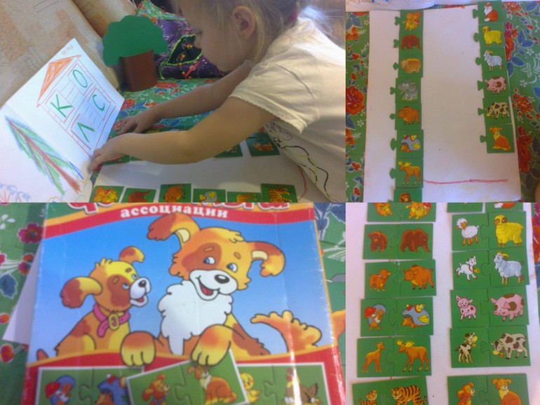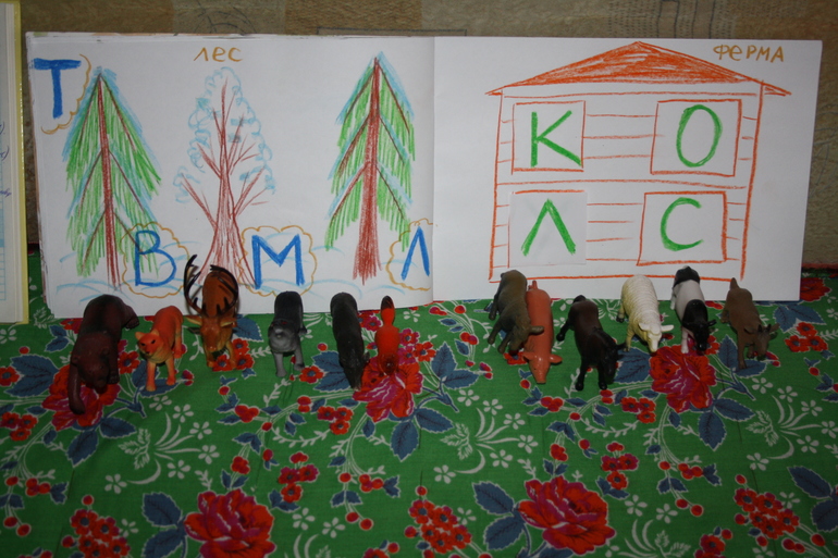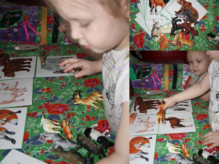 1. Отгадали животное (сделала в круге отверстие, Катя водила им по картинке и пыталась понять, кто там). Разделили всех на домашних и лесных.