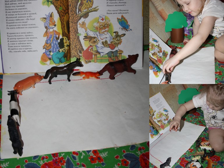 6. Помогли выстроиться зверям в очередь к Айболиту (ставили фигурки по инструкции: первый-медведь, последний-волк, в середине - ..., перед волком - ..., и т. д.)