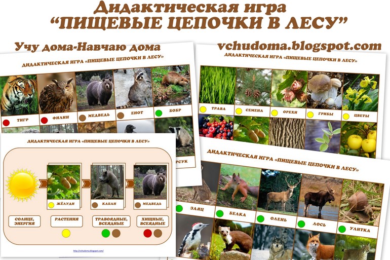 Интересная игра наглядно и доступно знакомит детей с тем, что такое пищевая цепь, как устроены пищевые цепочки в дикой природе леса.Приводится сценарий игры-путешествия в лес, где ребёнок учится различать животных по способу питания, составлять пищевые цепочки.