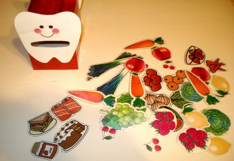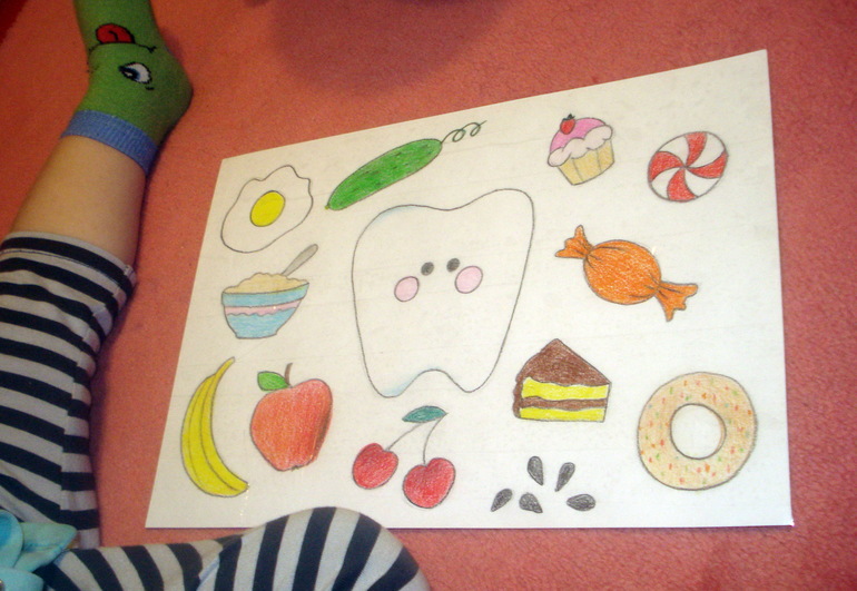 Рассмотрели картинку с полезными и неполезными продуктами. Все продукты показались моему мальчику вполне полезными, особенно заинтересовала конфетка, да собственно, всё, что справа на рисунке - вредная для зубов пища... В детской голове никак не укладывалась мысль, что такие вкусные няшки могут не понравиться зубику - переубедить не смогла...