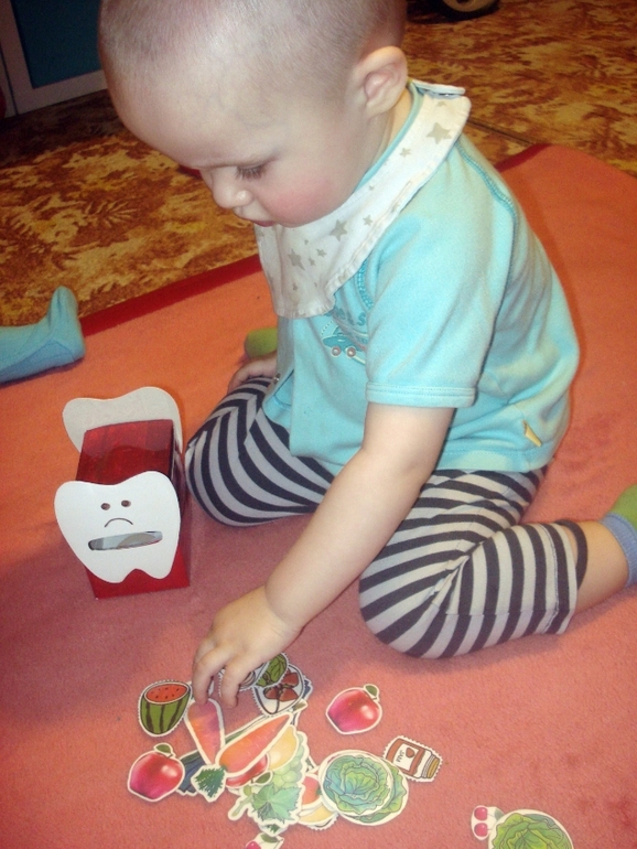 Предложила собрать лото с фруктами и ягодами - полезной пищей для зубов. Артём вдруг стал раскладывать картинки с фруктами из лото на нашу сегодняшнюю картинку с зубиком, нашёл банан и яблоко... Молодец, сообразительный мальчик)
