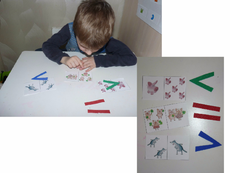 Продолжаем знакомиться со знаками. Здесь успехи у нас. Запомнил равно, больше, меньше. Справился с заданием сам.