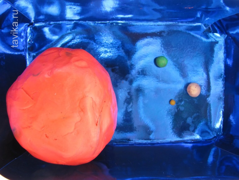 Самодельные игры, пособия. Хвастаемся!Мы с дочкой занимались изучением звезд. Больше всего ее потрясло, что, оказывается, наше огромное Солнце всего лишь крошка рядом с такими гигантами как Альдебаран и Бетельгейзе! А чтобы ощутить эту разницу, так сказать "на своей шкуре", сделали такое вот простое учебное пособие из пластилина: вылепили звезды в масштабе и поместили их в оклеенную фольгой коробку, снабженную легендой (чтобы не забылось что где). Получился кусочек настоящего космоса - в него можно даже играть :)