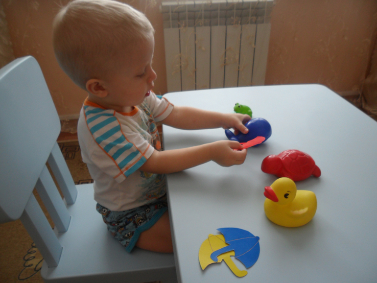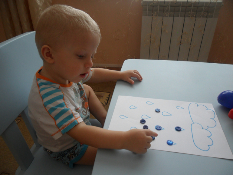 Второй день изучали дождик. Рассматривали картинки на стене, отметили погоду на календаре. Сделали зарядку, поиграли с зонтиком под музыку прятались от дождя, попрыгали через лужи. Послушали звуки дождя. После такой веселой игры сели немного поиграть в спокойные игры. Сделали дождик тучке из прищепок, капельки дождя из мозаики и пуговиц, раздали зонтики зверюшкам, сначала по размеру, потом по цветам, считали тучки, играли с водой.