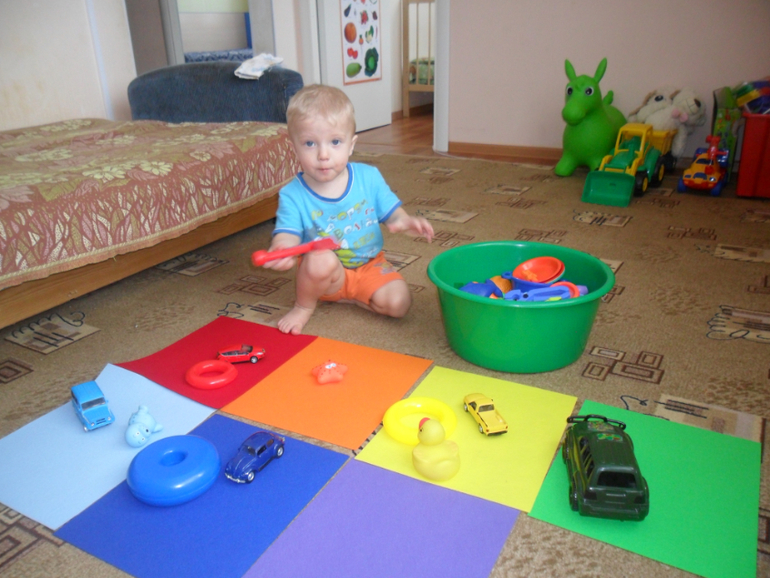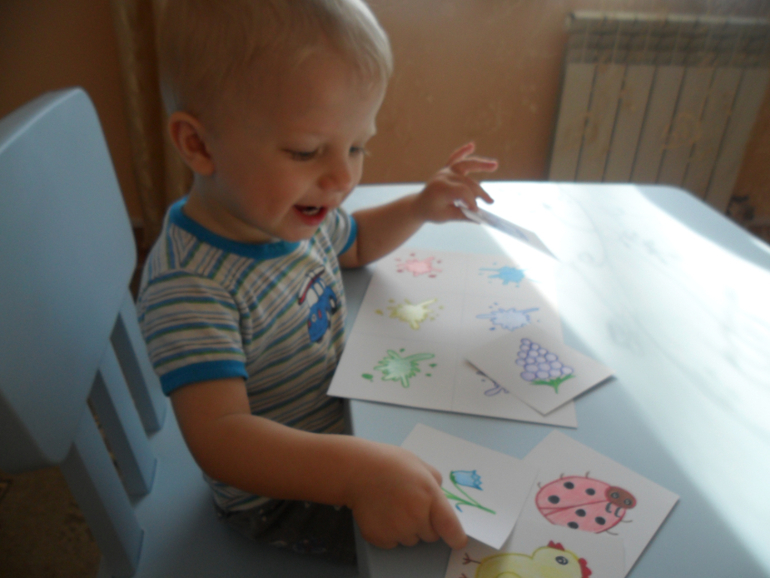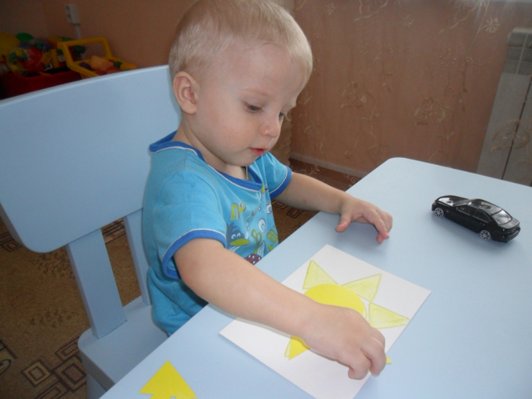 Вот мы как поиграли. Первым делом сделали зарядку, потом побежали искать солнышко по дому, намазались кремом от солнечных лучей и пошли гулять в кепке. На улице солнышка мы в этот день так и не дождались, поэтому в солнечные зайчике поиграть не удалось, зато поиграли в другие игры. Солнышку сделали лучики из прищепок, поиграли в лото, считали где много облачков и солнышек, а где мало, выложили из счетных палочек лучики, что лишнее (Рома пока не понял), разложили солнышки по размеру, наклейки, геометрия, ну искали предметы такого же цвета, что и солнышко.