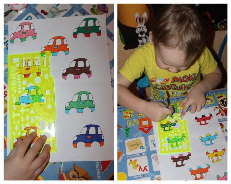 2) Вторым заданием Артёму были предложены машинки без колёс. Необходимо было нарисовать колёса с помощью линейки-трафарета.