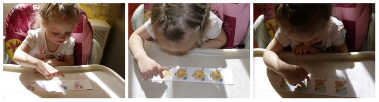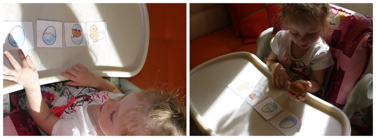 4. Последовательность. Лиза разложила и рассказала, потом рассматривали яичко и сравнивали с нарисованным, говорила что там ципленок.