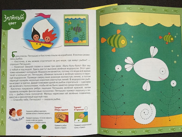 У нас есть "Холодная сказка" и "Теплая сказка". Пособия понравились. В форме сказок про Кисточку и Пятнышко рассказывается о цветах, их смешивании и свойствах. На второй странице разворота задание для малыша.