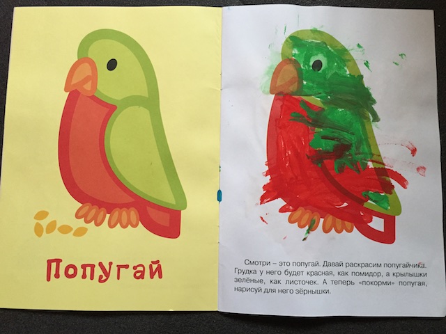 Здесь малышу нужно всего лишь поставить в нужном месте точки пальчиками, чтобы закончить рисунок. Просто и весело, нам обеим понравилось и я купила еще две из серии. В 1,5 года маме придется, конечно, подсказывать и показывать. А после двух уже и сам малыш догадается, что нужно делать. (фото не мое, так как одну тетрадку мы уже полностью изрисовали и выбросили, а остальные остались в России).