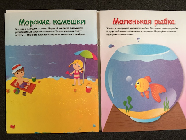Понравилось, что, например, в "Холодной сказке" рассказывается о том, что море может быть разных цветов, но все эти цвета - холодные. То есть детям не прививается шаблона: море - обязательно синее, а показывается, как оно может меняться и с чем это связано. Текста довольно много, младше двух лет я бы не рекомендовала, оптимально - от 2,5. Задания есть полегче, как с капельками, и посложнее. В каждой книжке четыре сказки-задания. Странички довольно тонкие. Думаю, краска может просвечивать и тогда неудобно станет читать сказки на обороте. Планирую отсканировать задания и давать их Насте на отдельных листочках.