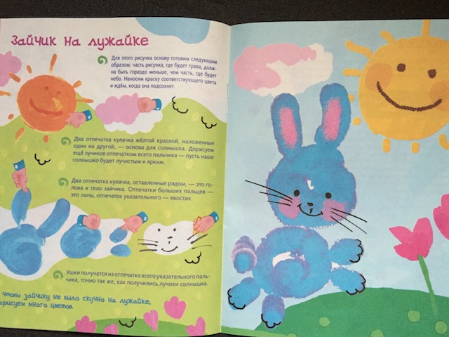 Немецкая книжка о рисовании ладошками, нам ее подарили. Похожа на "Рисуем пальчиками" Давыдовой, но все рисунки даны на белом фоне и с пошаговой инструкцией, ну и по объему она больше, плюс твердый переплет.
