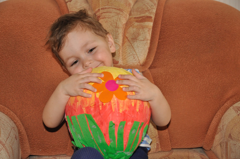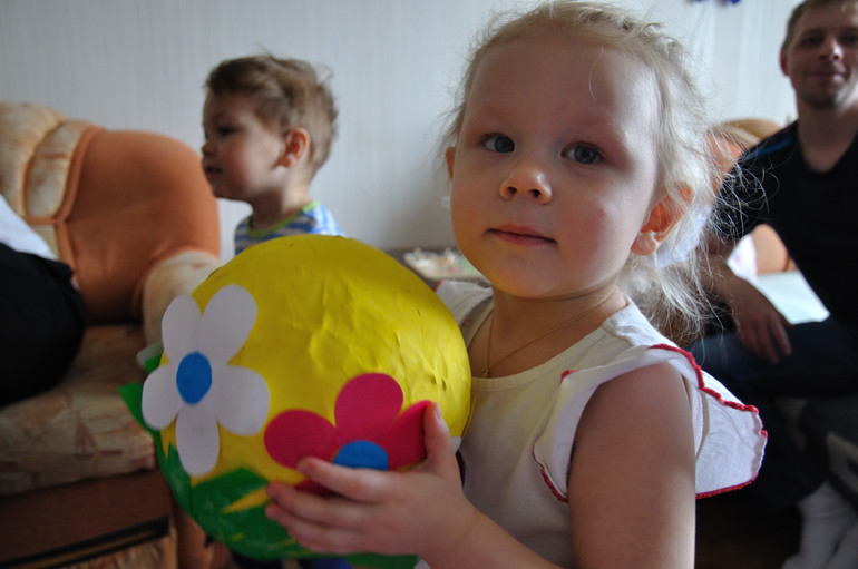 Наградой для детишек стали самодельные пасхальные яйца папье маше наполненные конфетами, резинками для волос для Полины, машинкой для Егора. Было весело.