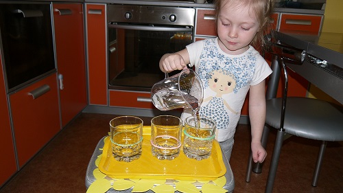 В нашем случае уровень-это резинка, сначала по уровнюлила, а потом просто стала переливать из стакана в стакан .... . а потом все вытирала за собой.