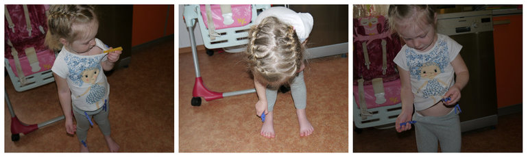 На одежде в разных местах прищепила прищепки. Лизе приходится снимать из разных положений. Справилась легко.