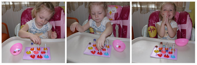 Трубочки воткнула в пластилин. Начала делать быстро, но оказалось не все так просто, пришлось ставить очень аккуратно, после того как несколько раз сбила соседние - стала осторожнее, поставила все