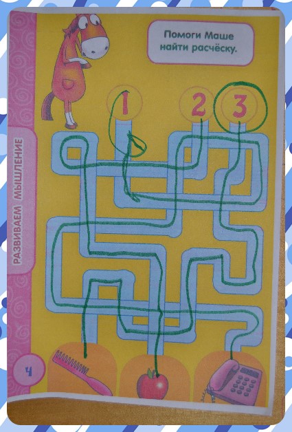 4. Гребёшок искали в прихожей. Гребешком расчесывали друг друга, рассмотрели остальные виды расчесок. Сравнили. Обсудили, что такое зубья на гребешке. Сделали задание-лабиринт :-).