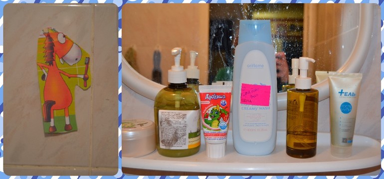 6. Тюбик зубной пасты конечно был в ванной. Заранее на полочке я расставил разные баночки. Илья искал самую высокую, самую низкую, самую тонкую, самую толстую. Можно искать по цвету (светлую, тёмную), по крышкам или колпачком и т.д.. Дала понюхать содержимое баночек. Обсудили запах и отправились купаться:-))