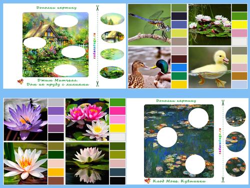 2. Дополни картину (Клод Моне, сказочный домик с прудом Джима Митчелла), задания на развитие цветовосприятия: