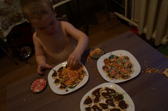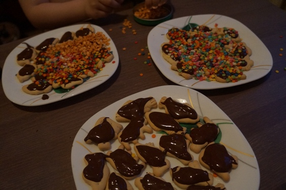 Вечером сделали пасхальные печеньки (растопила шоколад, Артем потом поливал его на печеньки, а потом украшал посыпушками).