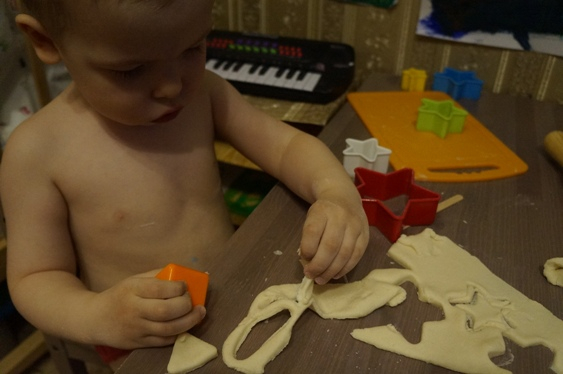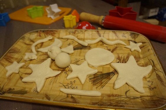 Решила сделать космическую тематическую коробку со звездами, Солнцем и Луной. Из соленого теста вырезали фигурки: