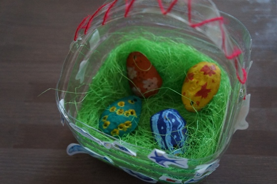 Раскрасили и положили в самодельную пластиковую корзинку. А! забыла! Утром пока Артем спал я спрятала в комнате 5 яиц (настоящих крашенных) и он их потом искал. Игра ему была знакома по англ книге Салищевой о Пасхе.
