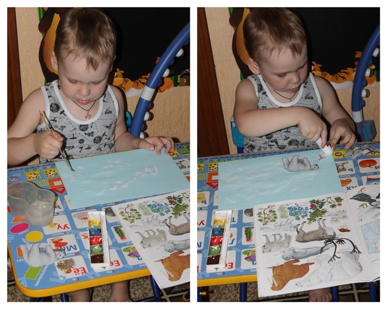 Заканчиваем первый день творчеством. Рисуем зимний пейзаж. Приклеиваем животных.
